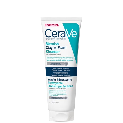 • CeraVe Gel Moussant Anti-Imperfections : Ce gel moussant contient de l'acide salicylique qui aide à exfolier la peau et à éliminer l'excès de sébum.